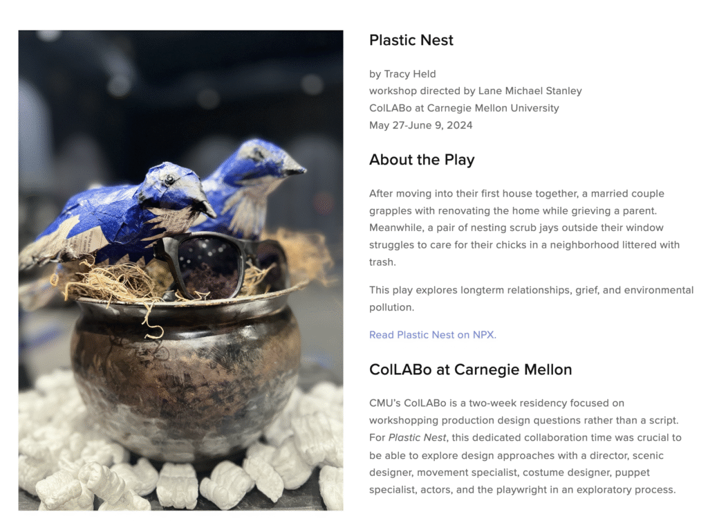 In 2024, I was honored to receive a 2-week developmental process at Carnegie Mellon University for my full-length play, Plastic Nest, which I wrote at CMU as a Dramatic Writing MFA student. It was a privilege to play with design questions with my team: